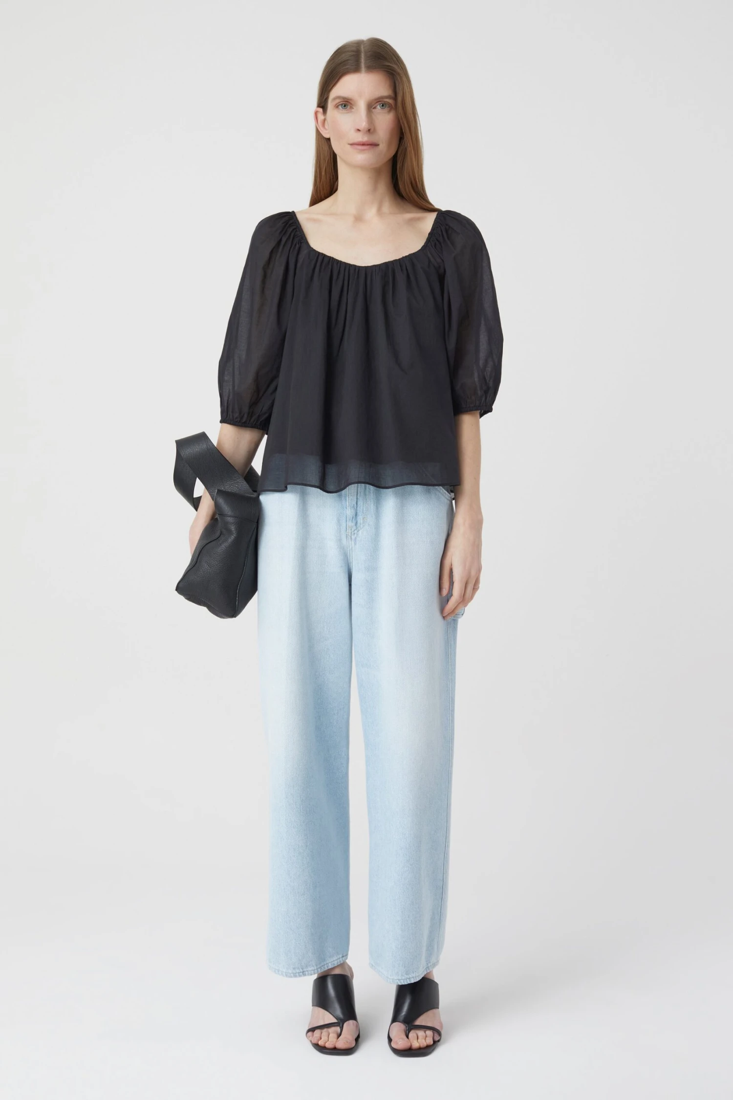 In A-Linie geschnittene Halbarmbluse aus sehr leichtem Baumwoll-Voile mit elastischen Ärmelabschlüssen und Futter aus Viskosestoff.