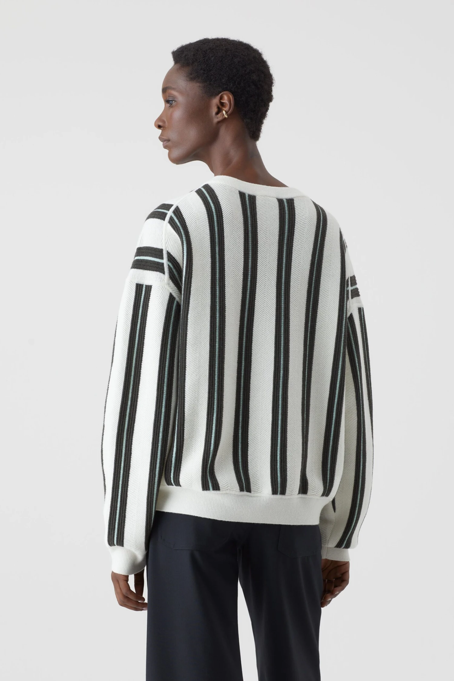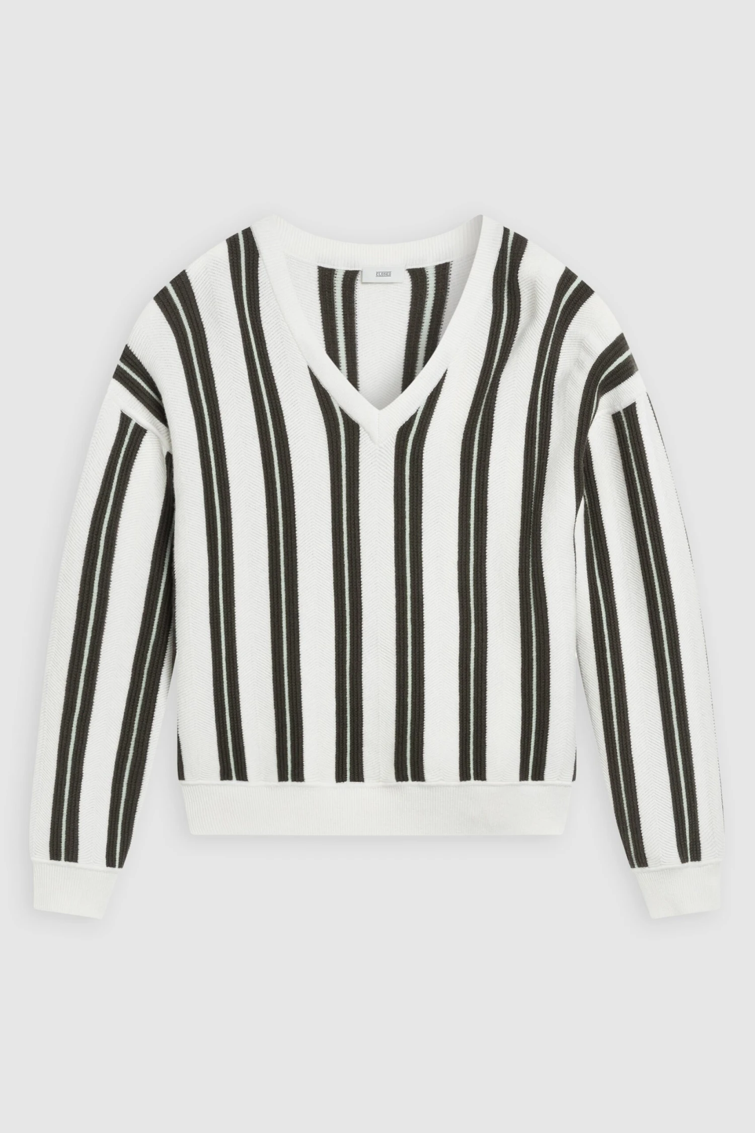 V-Pullover mit Längsstreifen aus weichem Merino-Cashmere-Mix im Feinstrick (12 gg). Relaxed Fit mit V-Ausschnitt und Rippbündchen.