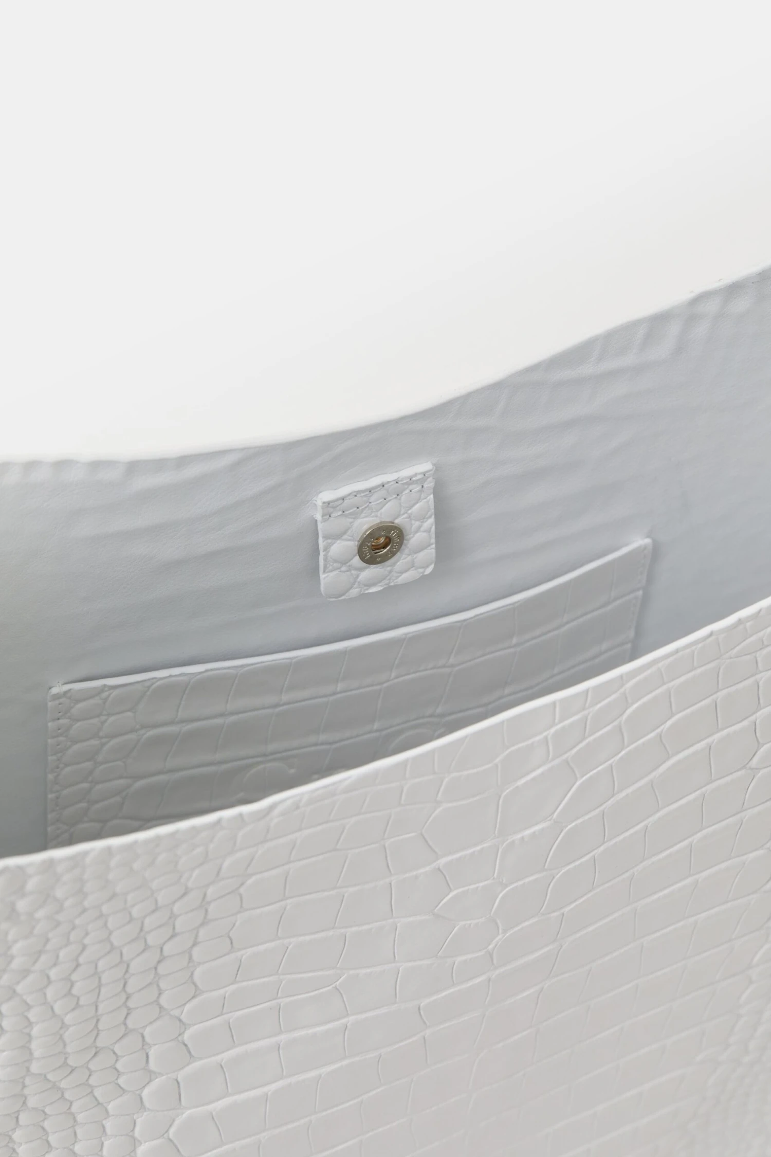 Mit Kroko-Prägung und Monogramm auf semi-glänzendem Leder: Unsere Half Round Bag mit breitem Riemen. Gefertigt aus großen Lederzuschnitten mit mehrfach handgefärbten und polierten Kanten. Kann per Druckknopf verschlossen werden und hat ein Steckfach innen.