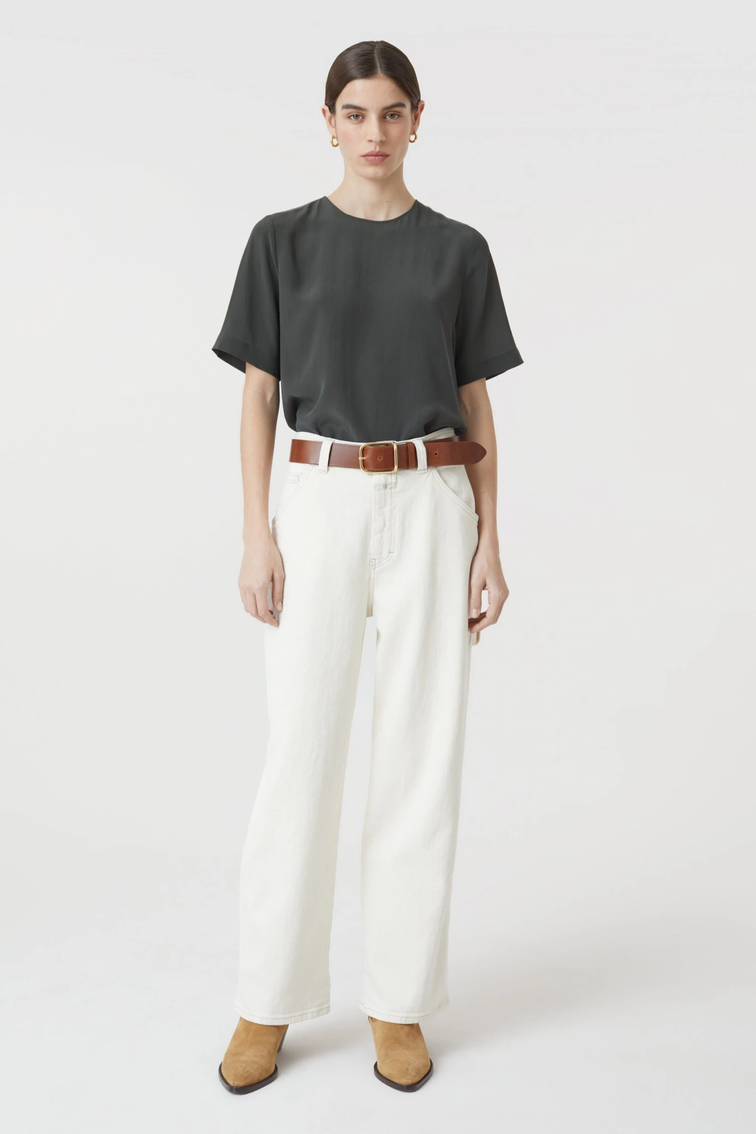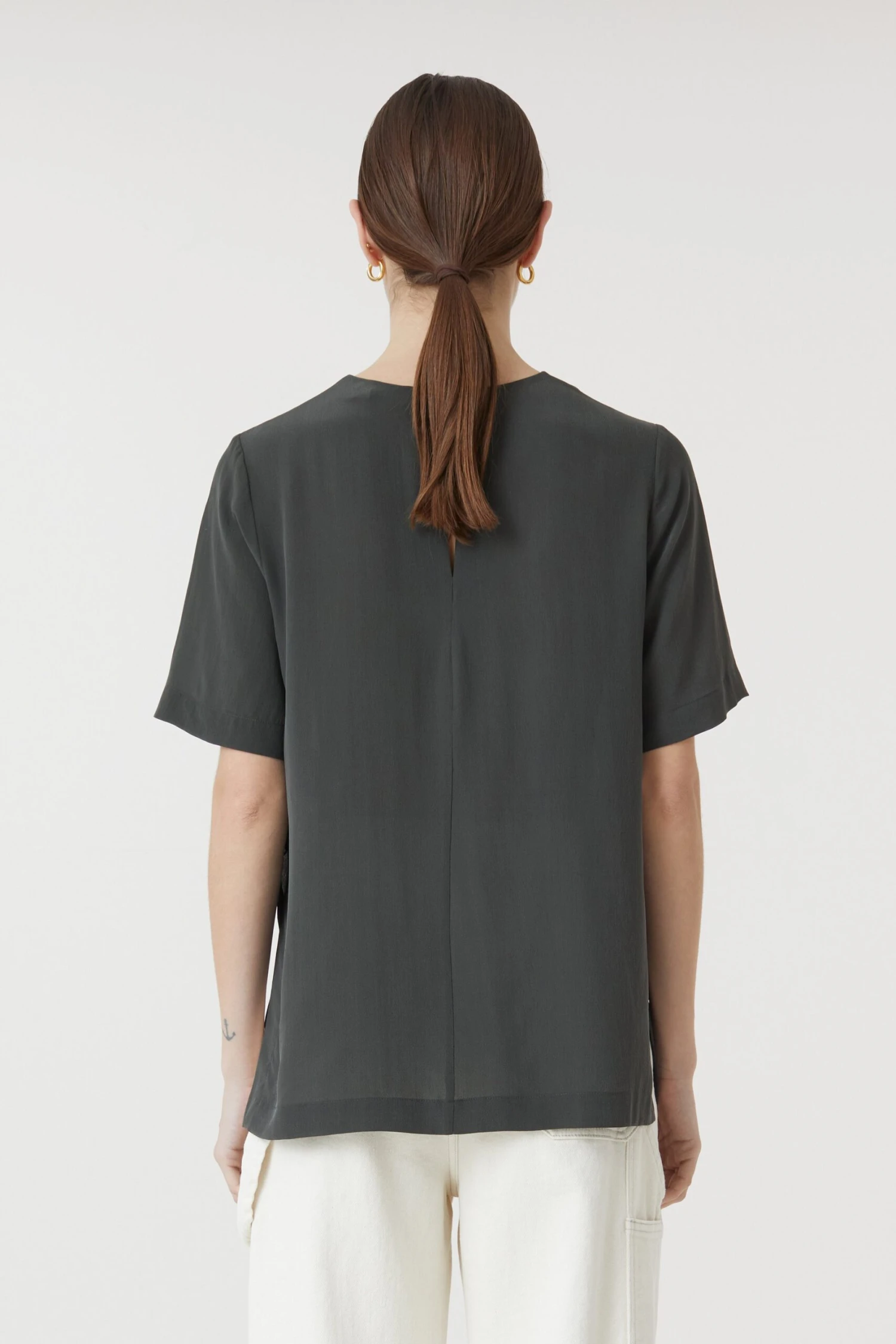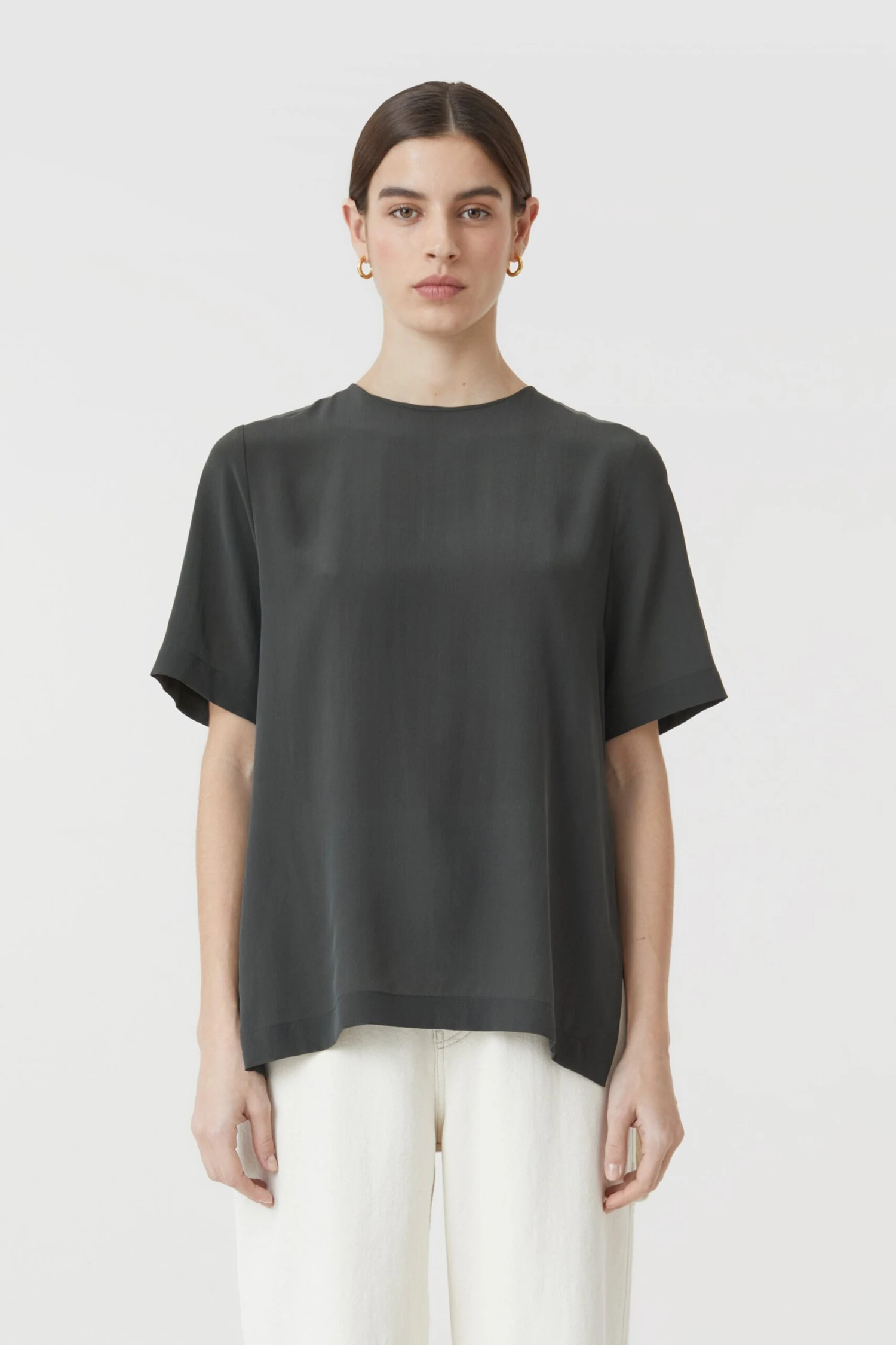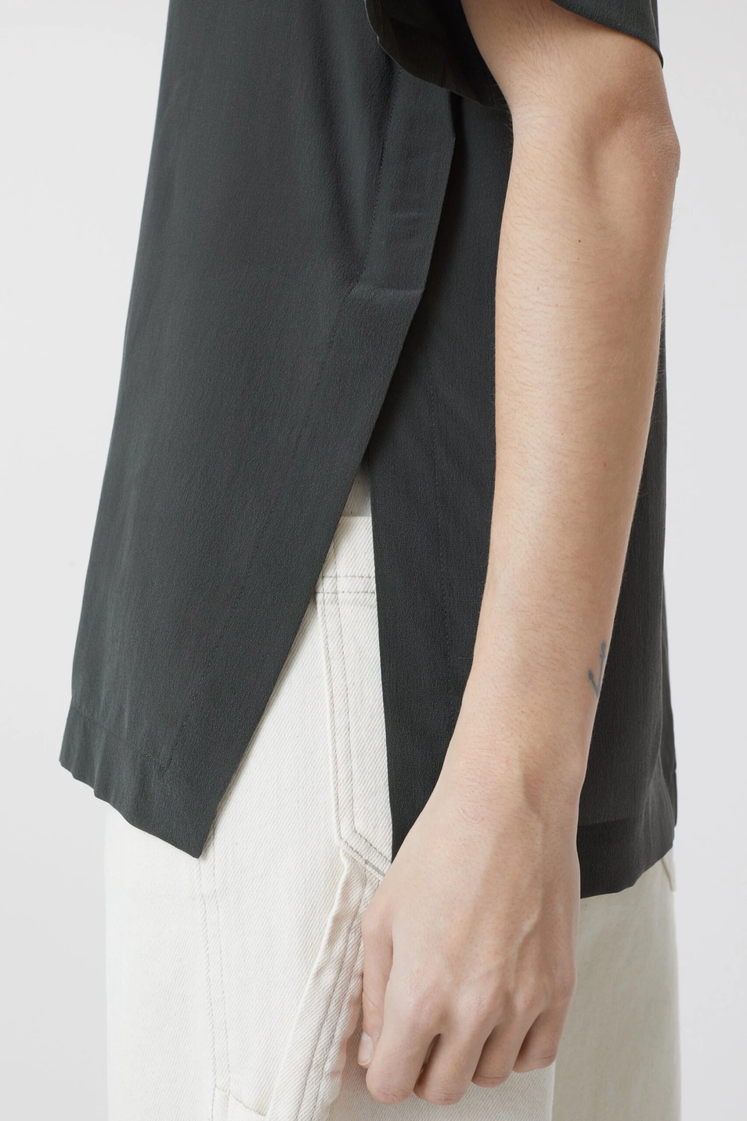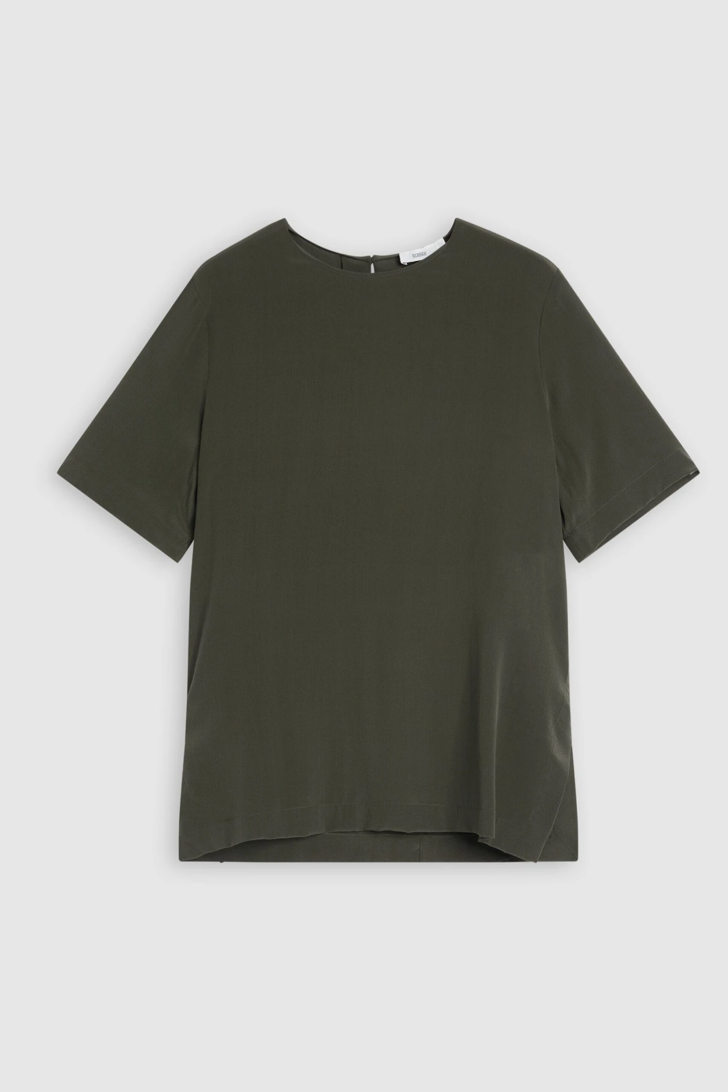 Aus weich fallendem Crêpe de Chine im cleanen Look: Bluse mit Rundhalsausschnitt und Seitenschlitzen.