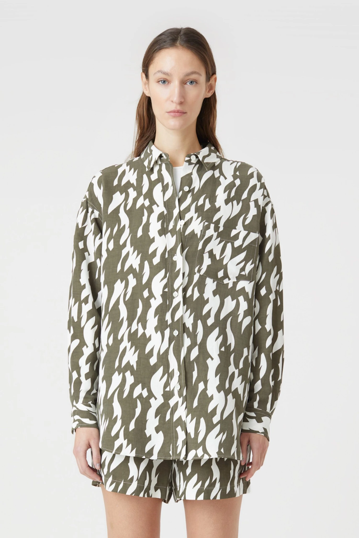 Unser Basic Shirt mit grafischem Muster besteht aus Seide und Leinen. Das relaxt geschnittene Hemd hat einen sehr weichen Griff und eine fließende Optik. Es ist mit einer Brusttasche, Perlmuttknöpfen und Manschetten ausgestattet.