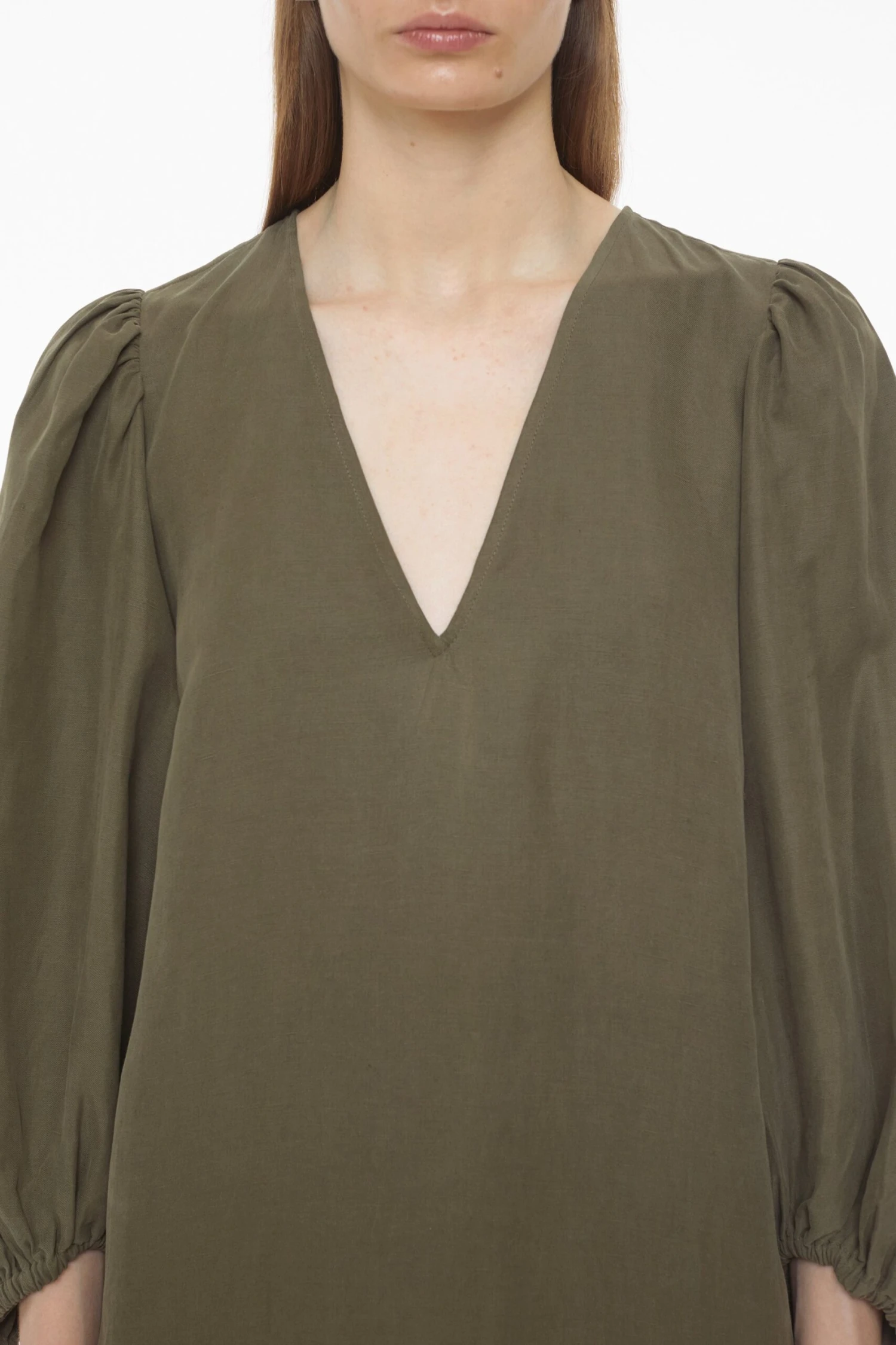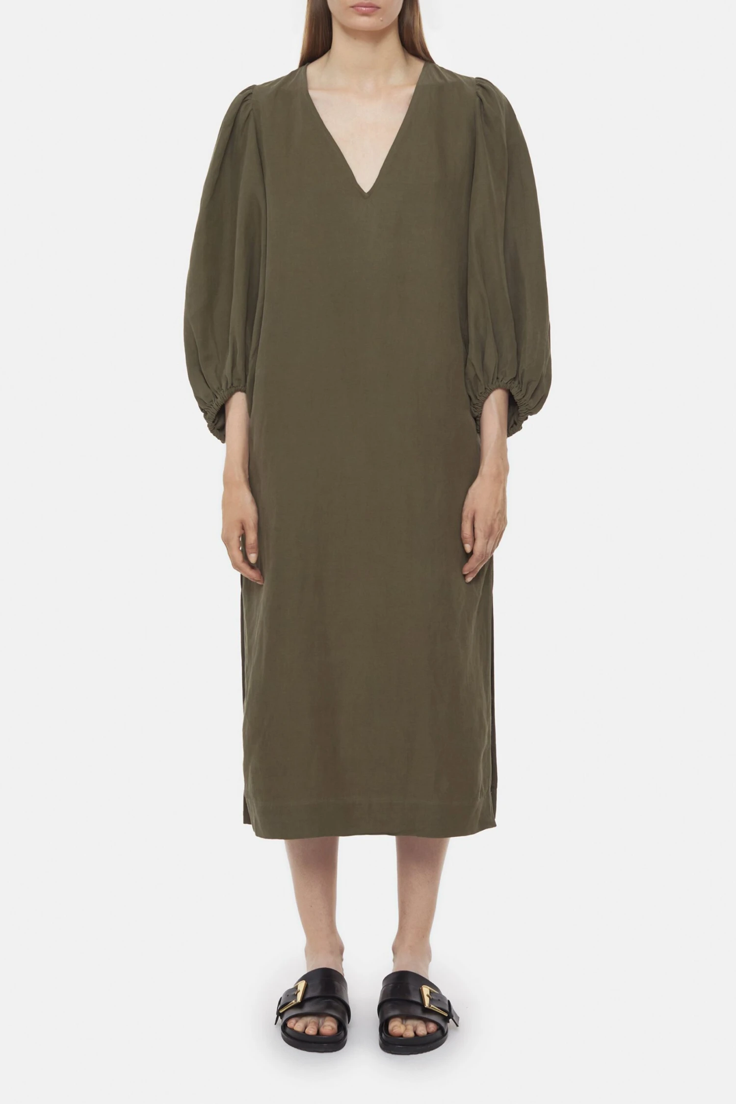 Der sehr leichte Seide-Leinen-Mix verleiht diesem Kleid ein angenehmes Tragegefühl. Es ist relaxt geschnitten und mit elastischen Ärmelabschlüssen, V-Ausschnitt sowie mit einem gerade geschnittenen Saum und Seitenschlitzen ausgestattet.
