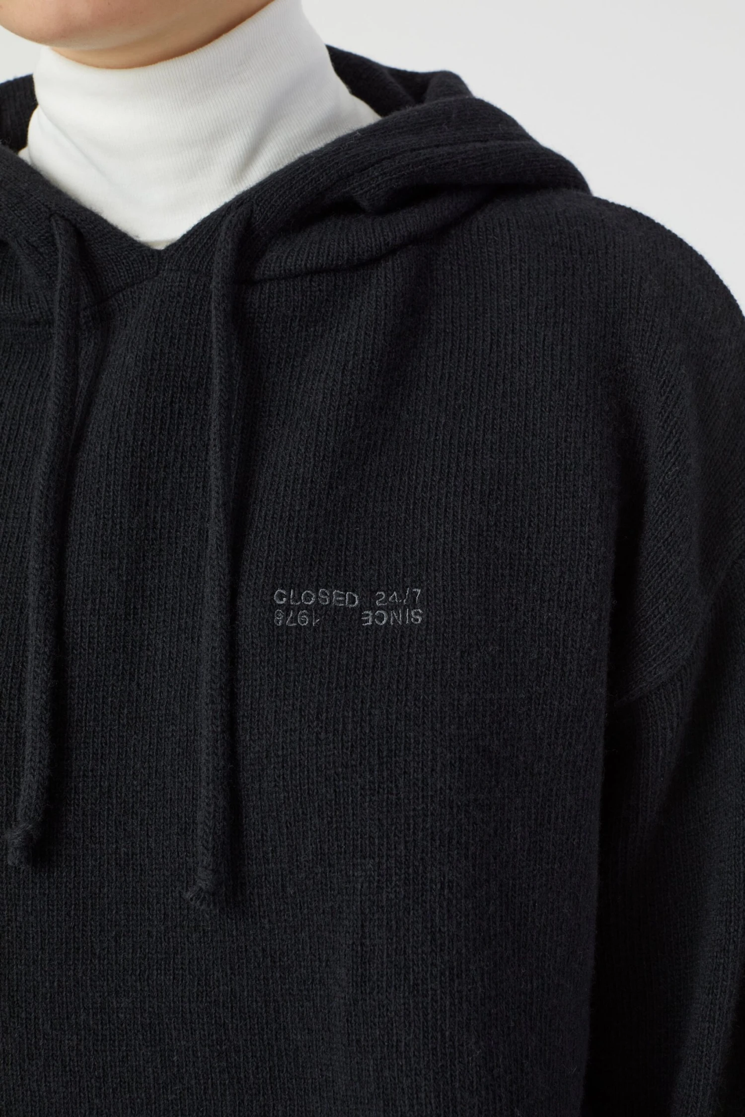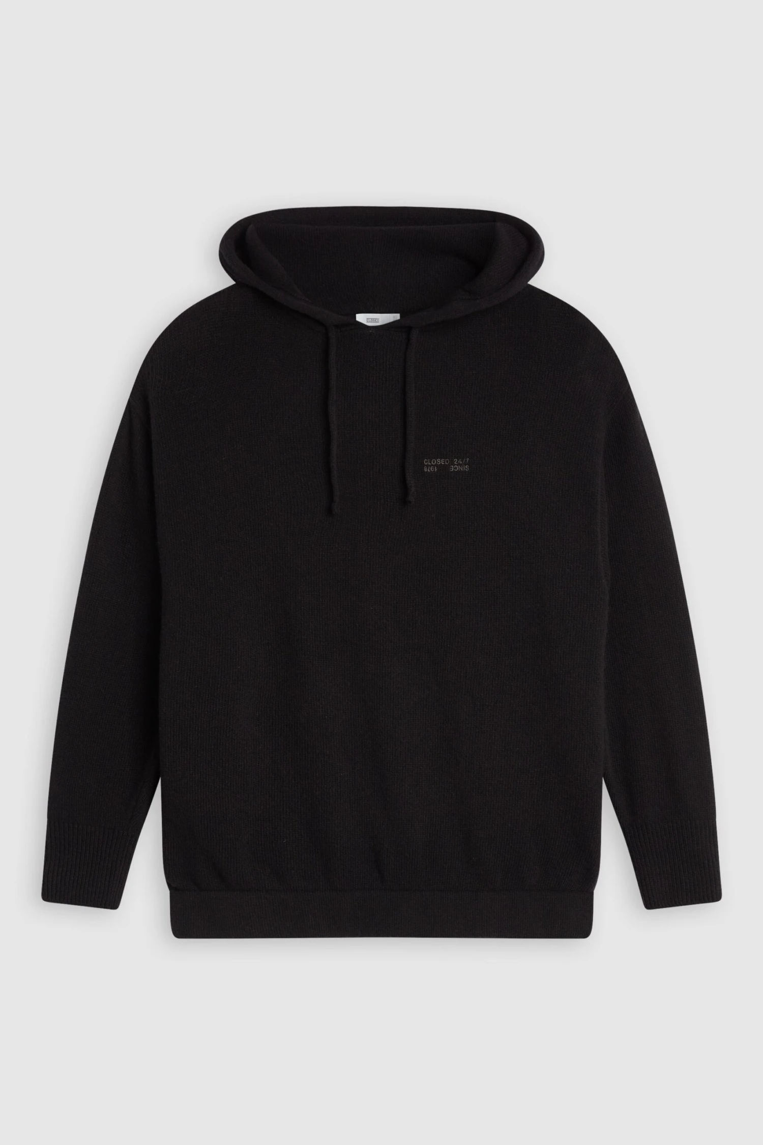 Aus weicher Lammwolle im mittelschweren Strick: Hoodie mit doppelt gestrickter Kapuze und Tunnelzug, Closed 24/7- Stickerei, leicht überschnittener Schulter sowie Rippbündchen an Ärmel- und Saumabschluss.