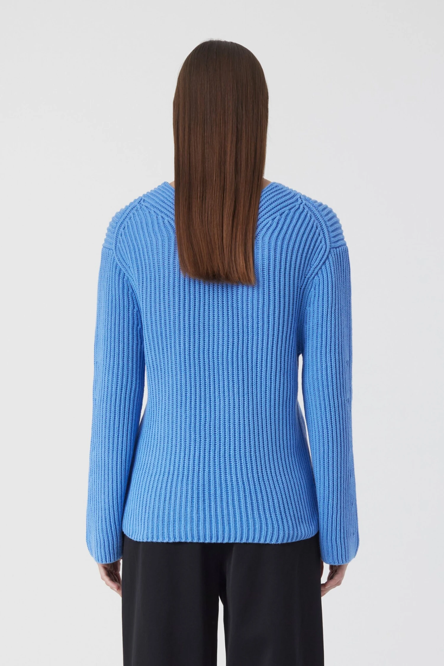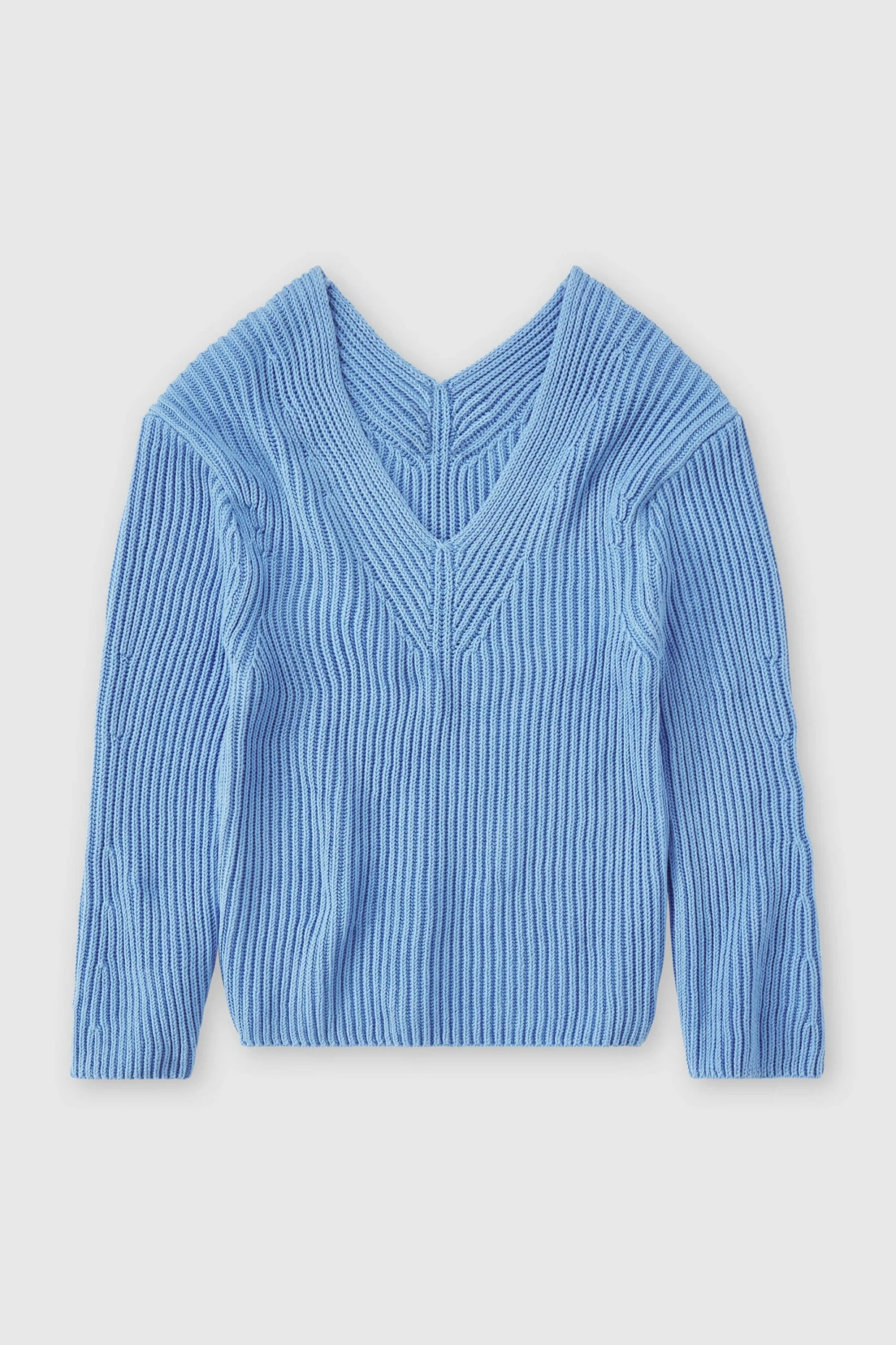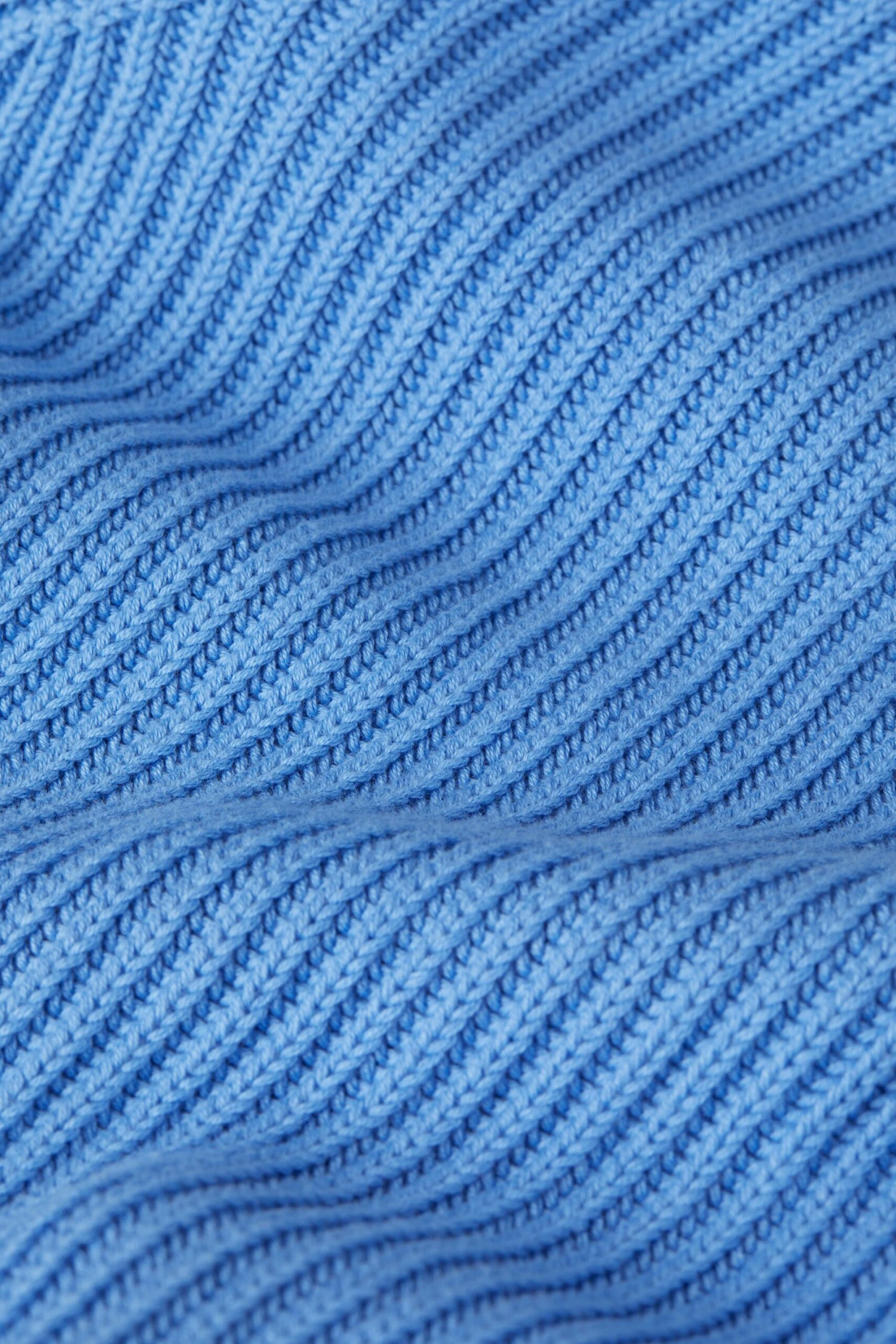 Dieser Pullover im Fisherman’s Rib wurde aus reiner Bio-Baumwolle gestrickt. Die Rippstruktur entlang des Ausschnitts betont die V-Form. Die Ärmel sind leicht ausgestellt geschnitten.